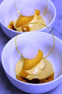 「ダコワーズココ」「ソルベエキゾティック」「ジュレフレーズ」「マンゴークーリー」「ムースマンゴーパッション」「ブールユズ」「フレッシュマンゴー」「黄色のアメのリング」という8種類のアイテムの融合。日本の代表的な食材であるユズの香りと、パッションフルーツ、カルダモンというスパイスなど、さまざまな味が楽しめるスイーツ。
