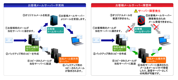 また、お客様が利用されているメールサーバーが障害で使えなくなったケースでも、当社メールサーバーを使ってのメール受信・送信を引き続き行うことができ、メール業務をストップしてしまうリスク対策にもなります。