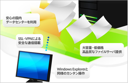 「ファイルサーバ アウトソーシング」は、国内の大手データセンターにクラウド環境を構築し、Windows Server 2008 R2のファイルサーバを提供します。ファイルサーバとの通信は各種選べるVPN(SSL-VPN/PPTP/sapphire(サファイア)サービス)で暗号化され、フォルダ、ファイル単位でのアクセス権限設定ができるため、企業利用としても安心してファイルサーバのアウトソーシングが行える設計となっています。操作性は社内にあるファイルサーバと同様(Winエクスプローラー同様)で、マニュアルや教育などは一切必要としないユーザビリティを実現しています。