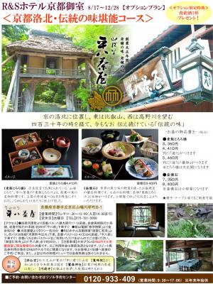 その一環として、リソルの運営施設のひとつ「R&Sホテル京都御室」では現在、京都洛北で安土桃山時代より430年ものあいだ伝統の味を受け継ぐ老舗店「山ばな 平八茶屋」とタイアップして『京都洛北・伝統の味堪能コース』の昼食オプションプランを企画、12月28日(金)までの予定で開催中です。
