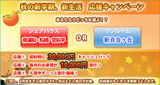 初期費用と格安家賃なシェアハウスandシェアハウス式ワンルームを運営するインターワオが応援する秋のキャンペーン!