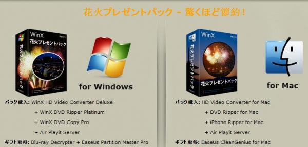 このセットは花火大会を祝うための最大な割引です。Windows版とMac版が同時公開しています。Windows用のは動画変換ソフトウェア「WinX HD Video Converter Deluxe」、DVDリッピングソフトウェア「WinX DVD Ripper Platinum」、DVD書き込むすことできるソフトウェア「WinX DVD Copy Pro」、iPhoneyAndroidにビデオをストリーミングできる「Air Playit Server」のセットです,特別価格40.95ドル(通常価格125.90ドル)で、さらにこのセットを購入した方にMac用のはブルーレイの暗号解読と変換ソフト「Blu-ray Decrypter」とPCディスク管理ユーティリティ「EaseUs Partition Master Pro」を無料で提供しています。