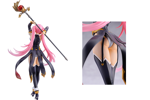 風に舞うツインテールや伸びやかな肢体といったボディライン以外にも、こぼれんばかりの胸や脇の下など、見どころの多いフィギュアです。たなびくピンク 色の髪の毛はクリアパーツで成型され、淡く輝く質感を再現。武器である聖錫や服の飾りもフィギュアならではの作り込みと彩色で仕上げられています。