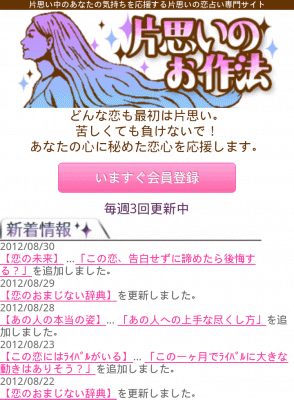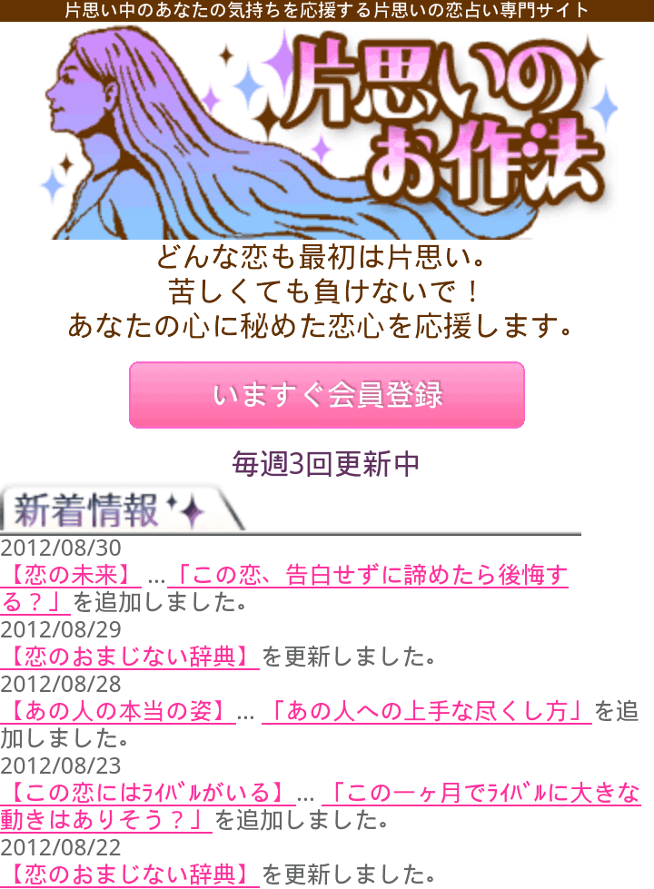 【片思いのお作法】は、2009年10月にau公式コンテンツとしてリリースされた、片思い中の方を応援する、一方通行の恋、片思いの恋専門の占いサイトです。