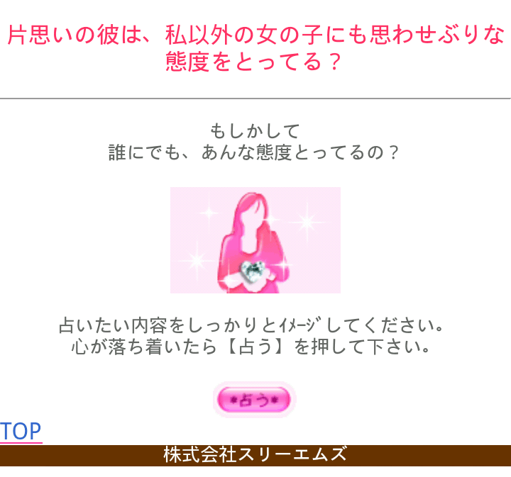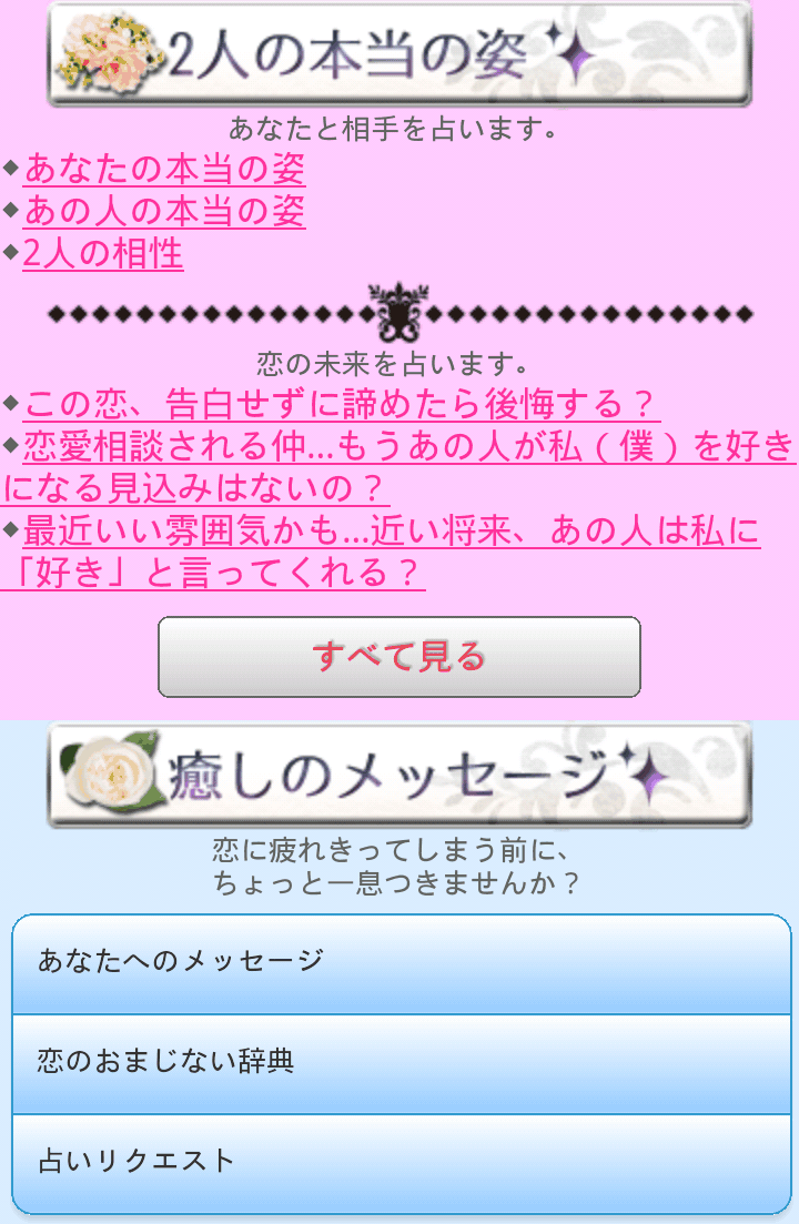 500種類以上の占いメニューは、「友達」「元恋人」「顔見知り」「ネット恋愛」「パートナーのいる相手への恋心」…など、恋の状況/相手との距離レベルを基準にしたカテゴリーに分類されていますので、「今の恋の状況に最適な、一番知りたいこと」がダイレクトに占えます。