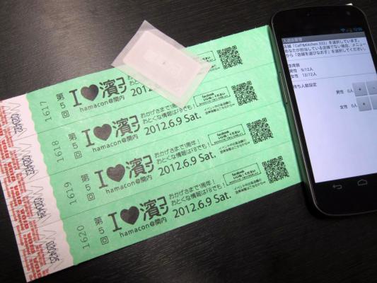 ・ICタグ付きのリストバンドは、本アプリでは、ソニー株式会社のFeliCa Lite (NFC Forum Type3 Tag)を採用。イベント受付にて、PC用の非接触ICカード リーダー/ライター(PaSoRi)を用いてパソコンで関連付けしたものを配布。リストバンド以外でも電子マネー/交通系ICカードやおサイフケータイ等を入退室管理に実用可能です。