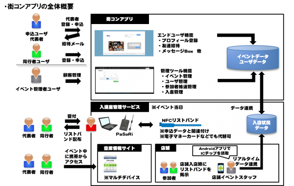 地域活性化活動のスタイルとして注目を浴びる「街コン」は、複数飲食店を回遊しながら各店舗での男女の新しい出会いを楽しむ参加型の町興しイベントとなっています。主に地域商店街などが主体となって運営され、2011年度下半期に始まり、今や全国都道府県で一斉に広がったこの活動モデルでは、参加者の顧客情報を取り扱う情報管理の不十分という課題や、また、一部の店舗への参加者の偏りによるイベント当日の各店舗の混雑状況の平準化などの課題も存在しています。本アプリではそれらの課題解決を図る為に、二人参加が基本である街コンのリピーター参加者の申込みを安心安全に簡素な申込みにつなげることや、NFC※1の特徴を活かした入退室管理機能ではイベントスタッフが持つ専用アプリをインストールしたスマートフォンで、参加者のICチップ付きリストバンドを非接触でタッチすることで情報を取得し、リアルタイムに全店舗の席数状況の見える化を図ることが可能になります。各店舗の混雑度への対策として、全国各地の事業者では、参加者が行ける店舗を運営サイドで全て指定することによる混雑度の平準化の問題対策を図っている姿が見受けられます。しかしながらこの対策では、自分の行きたい店舗を自らで選択することが出来るという参加者へのメリットを損ない、食べ歩きイベントならではの特性を活かし切れていないという現状があります。本アプリを採用することで、参加者、事業者、街にとってもメリットの高いイベントモデルとしてその付加価値向上につなげて頂くことが可能と考えております。