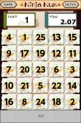 「Ninja numbers」(ニンジャナンバーズ)は簡単でシンプルなタッチゲームで1から50までのパネルを順番にタップし、そのタイムを競うという単純かつ明快なルールです。