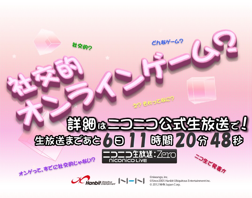 オンラインゲームの楽しみ方を大きく変えるこの新作タイトルの詳細は、ニコニコ動画の公式生放送にて発表いたします。