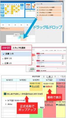 ・管理側予約カレンダーで予約メニューをドラッグ&ドロップで直接タイムテーブルへ移動し予約登録することができます。