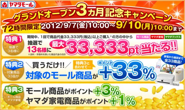 をコンセプトにヤマダ電機が運営する「ヤマダモール」にて、9月7日(金)10時~9月10日(月)10時の期間限定で、グランドオープンから丸3ヶ月の経過を記念して、YAMADAポイントが最大33,333ポイントが当たるキャンペーンを開催いたします。