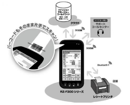 動作端末として対応を行ったRZ-F300シリーズは、流通小売業の現場で使用される業務用端末です。軽量コンパクトながらタッチペン入力で操作ができる4.3型の大型液晶、バーコードスキャナーを搭載して使いやすさを追求しています。無線LAN機能の他、3Gデータ通信や非接触無線通信規格「NFC」などに対応し、幅広い業務で利用が可能です。また、堅牢性を高めたボディを採用し、高い耐衝撃性能や防塵・防まつ性能を備えています。