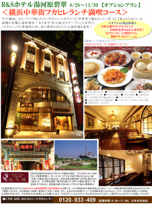 その一環として、リソルの運営施設のひとつ「R&Sホテル湯河原碧翠」では現在、テレビや雑誌、さらにアジア版レストランガイド(ミーレガイド)にも“中華街で最もおいしい店”として取り上げられている話題の老舗上海料理店「状元樓」(じょうげんろう)とタイアップして『横浜中華街フカヒレランチ満喫コース』の昼食オプションプランを企画、11月30日までの予定で開始しました。
