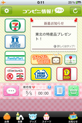 6大コンビニ(セブンイレブン/ローソン/ファミリーマート/サークルKサンク ス/ミニストップ/デイリーヤマザキ)のお得情報、食品、グッズ、女性に人気のスイーツの最新情報をワンタップで閲覧/横断検索できます。