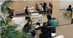 「知る・学ぶ(Notice)」「行動する(Action)」「共有する(Share)」をコンセプトにデザインされた空間は、他の就活生との情報交換を行うスペースや、就活に役立つ様々なイベントを実施するスペース、さらには事前準備を行うフリースペースなど、多目的な空間となっております。