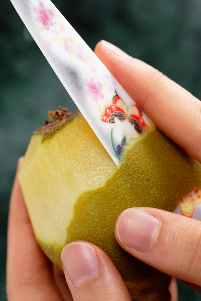 ブレードに、陶磁器で使われる上絵付け技法(800度で焼付け)でモダンでカジュアルな絵柄を