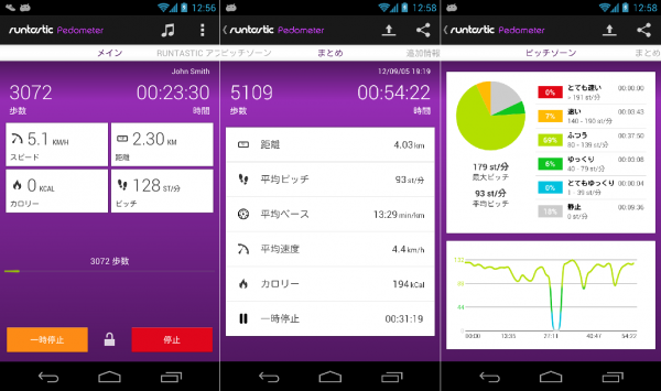 歩数だけでなく、歩くスピードや、歩いた距離、ピッチや、消費カロリーまで表示。手で持ち歩いたり、腰ベルトに取り付けたりしなくても、普段スマートフォンを持ち歩いているズボンやジャケットのポケットに入れ、スタートボタンを押せば計測を開始。GPSを使って計測する同社のアプリ「runtastic」とは異なり、加速度センサーを使って「歩幅」×「歩数」で距離が算出されるため、バッテリーの減り具合も大幅に改善され、ipodでも利用できるようになりました。