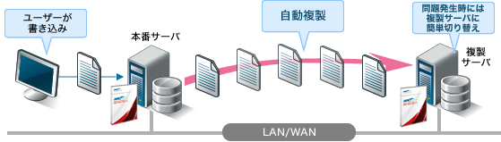 WAN(※)を経由したレプリケーションに対応しているため、遠隔地の複製サーバへもデータの複製が可能です。本番サーバが災害に見舞われた場合、遠隔地でデータを使用できます。