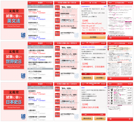 学習専門図書サイバーモールなどを運営する株式会社ブックモールジャパン(本社:埼玉県戸田市、代表取締役社長:山田俊明)は、iPhone 向け学習アプリケーションの新作として、株式会社文英堂の協力のもと本年2月に発売した『文英堂 試験に強い政治・経済』に続くシリーズ第2弾として『文英堂 試験に強い英文法』『文英堂 試験に強い世界史B』『文英堂 試験に強い日本史B』の3タイトルを開発し、「学参ドットコム」ブランドにて9月12日より App Store での発売を開始しました。