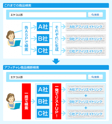 従来のアフィリエイト作業では、商品を紹介するための記事を書くことに加え、アフィリエイターが各ASPにログインして商品を検索し、そこから各々のアフィリエイトリンクを生成する必要がありましたが「アフィチャレ商品横断検索」では商品名やキーワードを入力するだけで、各ECサイトを横断してプロモーション可能な商品の検索結果を表示でき、一括でアフィリエイトリンクを生成できるようになります。