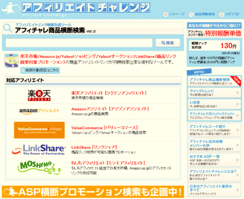 アフィリエイターのための通信教育サービス「アフィリエイトチャレンジ」を提供する株式会社もしも(本社:東京都渋谷区、代表取締役:実藤裕史。以下、もしも)は、本日(9/13)国内の主要な大手ECのアフィリエイト可能な商品を、プロモーション横断で検索できるツール「アフィチャレ商品横断検索」をリリースします。これによりアフィリエイターの作業のひとつであるアフィリエイトリンクの生成作業の効率化を実現します。「アフィチャレ商品横断検索」は通信教育サービス「アフィリエイトチャレンジ」の全ての受講者が利用できます。
