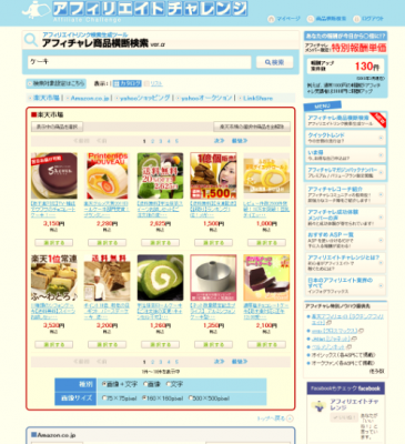 各ECをまたいで検索された商品の検索結果が一覧で表示され、プロモーション可能な「ケーキ」のアフィリエイトリンクを、複数種類、同時に生成することができるようになります。