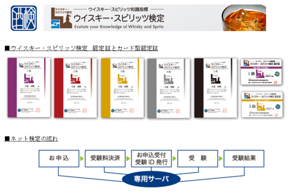 この度スタートした「ウイスキー・スピリッツ検定」は1級から5級まであり、1級と2級会場受験のみ、3級から5級は会場、ネット検定双方の受験方法に対応しています。