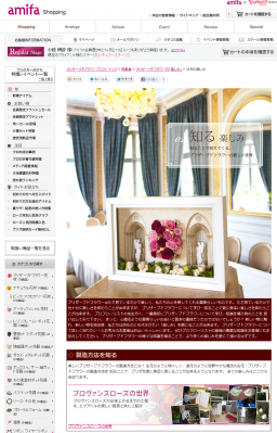 アミファはプリザーブドフラワー花材のショッピングサイトであると共に、花文化に関連した情報ページを多く掲載しているサイトである。プリザーブドフラワーは、およそ20年前にフランスで開発された技術で、日本では2000年頃から販売され、現在ではフラワー文化のひとつとして定着している。今回の特集は、プリザーブドフラワーについての製造方法・技術・歴史等を項目別にまとめている。プロのフローリストがビギナーへの説明にそのまま活用しやすく、花文化のより一層の発展を目指した内容となっている。