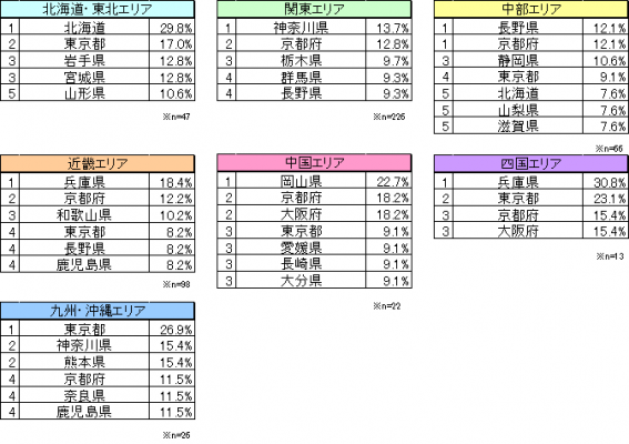 国内旅行予定地はいずれのエリアでも各エリアに属する都道府県または隣接する都道府県を中心にランクインしており「近場」志向がうかがえます。また、東京や京都といった観光名所の多い都道府県は、居住エリアに関係なく上位にランクインしています。