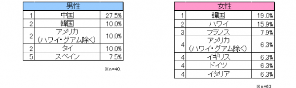 ■人気の海外旅行先は男性が1位「中国」2位「韓国」。女性は1位「韓国」2位「ハワイ」。
