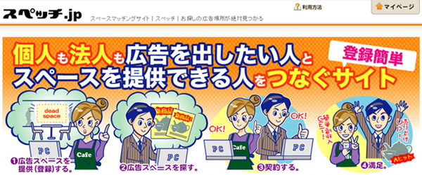 広告掲載希望者様は、広告代理店を経由させないことで、手数料を大幅に軽減。広告代理店では取り扱い が難しい個人が保有するスペースへも格安で宣伝できるというメリットがあります。