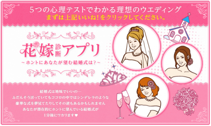 「花嫁診断アプリ」は、5つの質問に答えると自分の花嫁としてのタイプを診断し、その結果をもとに自分にあった結婚式のスタイルを知ることができるFacebook アプリケーションです。