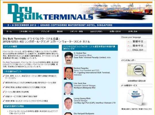 株式会社グローバル インフォメーションでは、皆様の利便性を図る為に、日本語、韓国語、中国語で「Dry Bulk Terminals ドライバルクターミナル会議」の情報を提供するとともに、会議の参加のお申し込みを承っております。