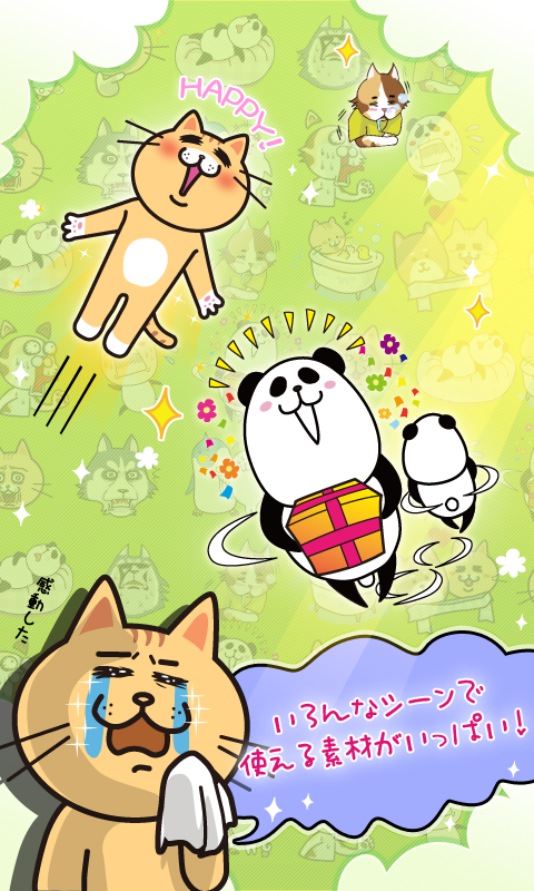 「嬉しい」「楽しい」「悲しい」といった基本的な感情はもちろん、各種挨拶や「驚く」「慰める」「寝る」「仕事」「ダイエット」「呑む」「病気」など日常の会話でよくやり取りされる様々なシチュエーションを、可愛い系からシュール系まで、個性豊かなキャラクター達で表現しています。