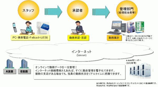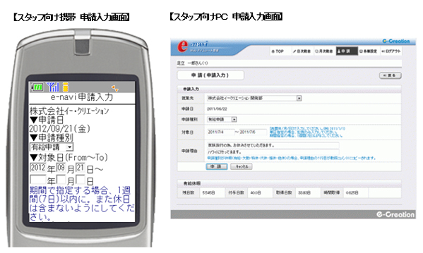 企業向けペーパーレス化ソリューションを提供する株式会社イー・クリエーション(本社:東京都台東区、代表取締役:伏見 剛)は、パソコン・携帯電話・FeliCaで出退勤打刻を行うペーパーレス勤怠管理システム「e-naviタイムシート」の申請機能のバージョンアップを行い、携帯サイトに対応させました。携帯電話から休暇(有休、特休他)や残業・休出などの電子申請が行えます。申請機能は、スタッフからの各種申請に対して、上長から承認・否認することができます。申請時に上長に自動メール送信することも可能です。