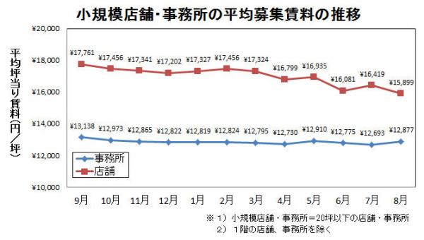 小規模事務所の平均募集賃料は、6~7月に2ヶ月連続下落していましたが、8月は一転1.4%上昇しました。
