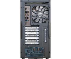 本体前面には最大動作音19dBの静かな3段可変速14cmファンが2台装備されており、回転数はシステム仕様に応じてフロントパネルから選択できます。底面と側面にも各1台の静音14cmファンの追加が可能です。背面に1台(2)、天板に2台装備されている14cmファンも最大動作音22dBと静かで、しかもシステムの発熱量に応じて自動的に回転数が変化する PWM(Pulse Width Modulation)方式を採用しています。さらに、ファンおよびハードディスクなどの振動による低周波騒音対策として、ファブリックコーティングされた高密度炭化水素系デッドニング・パッドを採用するなど、徹底した低騒音化を追求しています。