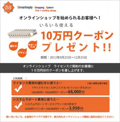 ショッピングモールシステム開発販売12年の実績をもつ ユニインターネットラボ株式会社(東京都中央区)は、パソコンとスマホ(スマートフォン)、モバイルのECショップが構築出来る「3S オンラインショップ(スマートリプライショッピングシステム フォー 1オンラインショップ)」を販売開始を記念して、オンラインショップを導入される方に使える、10万円クーポンを発行します。