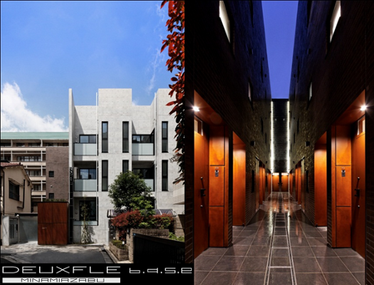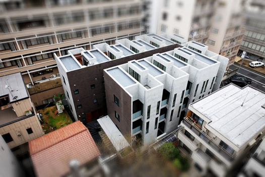 導入路のサイズにより集合住宅ビルは建てられない条件の土地で、中央に残した通路の両側に「上に延びた長屋」を配することで高密度ながらも快適な住居を作り出し、土地の有効利用を試みた例。上層階のメゾネット住戸は空に向かって明かり取りが開け、風の通りもよさそうである。下町の長屋を思わせる中央の通路は、導入路から見る住戸部の装飾を排したクールな印象にくらべ、各戸からの調理の香りが漂いそうなあたたかい雰囲気になっているところも好感が持てる。
