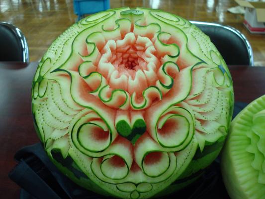 約40名が一斉にスイカとメロンのカービングをスタートし、