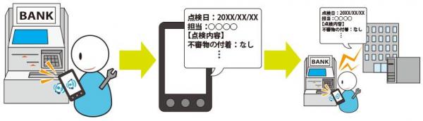 ○点検の後、スマートフォンをNFCタグにかざす → 管理用アプリ起動(メニュー:点検履歴閲覧、 点検内容作成) → 点検内容作成(管理ID、支店名、点検内容等)後、附着されているNFCタグにかざす → 管理サーバーにレポート転送