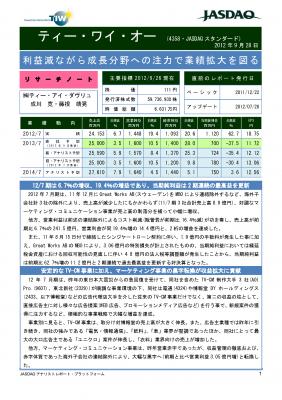2012 年7 月期は,11 年12 月にGreat Works AB(スウェーデン)をMBO により連結除外するなど,海外子会社計3 社の除外により,売上高が減少したにもかかわらず(11/7 期3 社合計売上高8.9 億円),好調なマーケティング・コミュニケーション事業が売上高の剥落分を補って小幅に増収。他方・・・