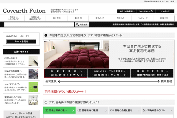 布団を「羽毛布団」「羽根布団」「機能性布団」の3種類に分けて、各々の布団を選ぶ際にナビゲーションを設けることにより、各商品の違いを理解した上で、お客様が欲しい商品にいち早くたどり着くことが可能になっています。