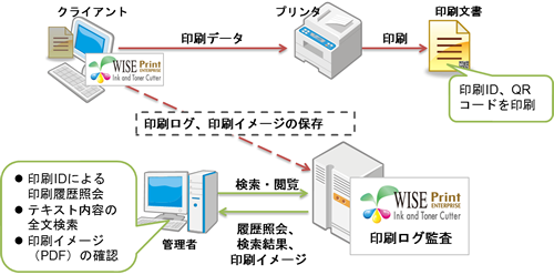 WISE Printサーバと、ユーザPCにWISE Printクライアントを導入することで、PC側の印刷ログ、印刷イメージの保存が実行され、「印刷イメージ保存・照会」「印刷内容のテキスト検索」が行えるほか、印刷物に「印刷情報のQRコード印刷」や「印刷ID印刷」などの処理を行えるようになります。