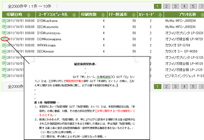 文書印刷時に、印刷ログおよび印刷イメージが保存されるので、印刷履歴照会画面から、印刷ログや印刷イメージの照会が可能です。これにより、実際の印刷物がなくても、どのようなイメージだったかを確認できます。