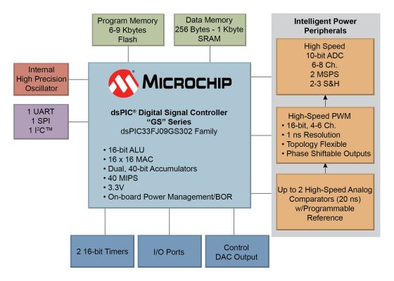 5つの製品で構成されるdsPIC33FJ09GS302ファミリは、高速ADC、ゼロウェイト信号処理コア、柔軟な高分解能PWMを内蔵しており、デジタル電源アプリケーションに最適です。これらのモジュールを効率的に相互動作させ、ms未満のデジタル制御ループを実現しました。このファミリはプログラマブルなヒステリシス特性およびレールツーレール動作に対応したアナログ コンパレータと、PMBusTMアドレス選択向け電流源も内蔵しており、外付け部品を削減できます。これらの新しいDSCは、GSファミリ製品の中で最も消費電力が少なく、20ピンSSOPパッケージで提供いたします。さらに小型の36ピンVTLAパッケージ(フットプリント: 5 x 5 mm)も初めて提供いたします。