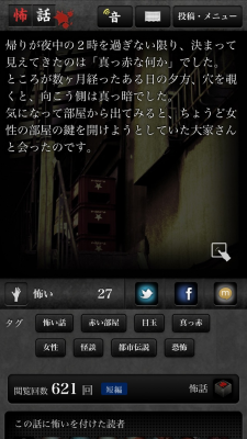 ・怖い話の評価・Twitter等のソーシャルメディアで共有する機能を備えています。