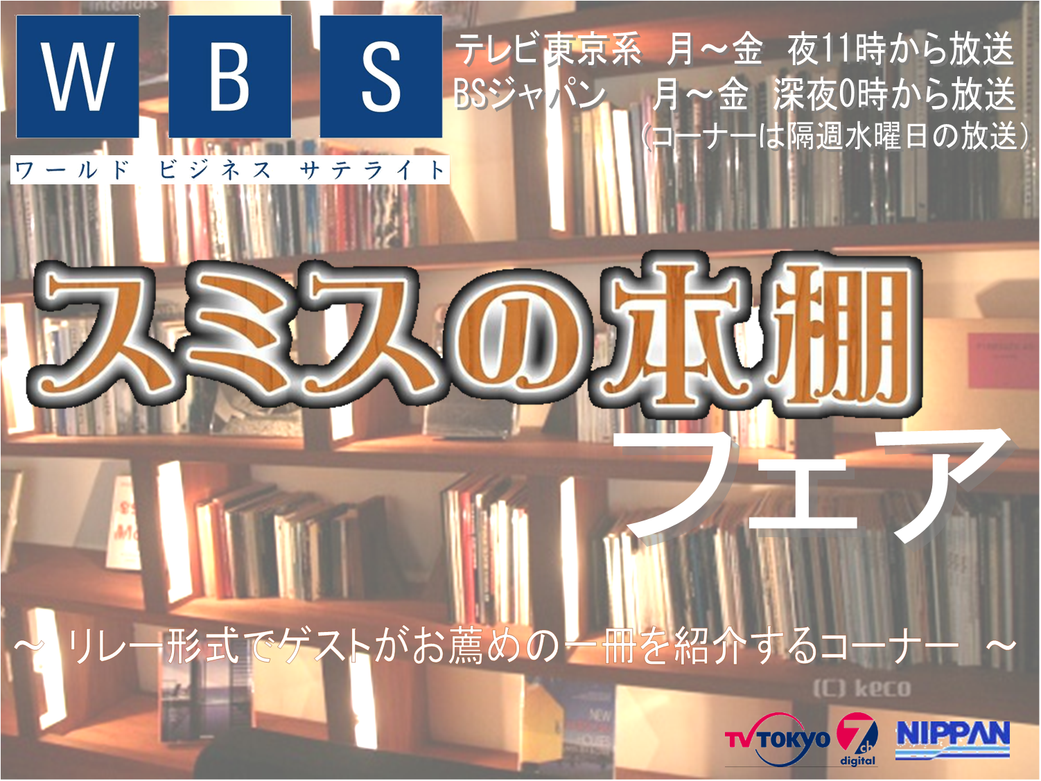 “「スミスの本棚」フェア”は、現在テレビ東京系列で放送中の番組「ワールドビジネスサテライト」(毎週月曜日~金曜日、夜11時から放送)内の人気コーナー「スミスの本棚」とのタイアップ企画です。隔週水曜日に放送されるこのコーナーでは、著名人がリレー形式でオススメの本を一冊紹介します。著名人の紹介した一冊は放送翌日に書店店頭で大きく売上を伸ばし、出版社は続々と重版を決定するなど、業界内外から「スミスの本棚現象」と呼ばれるほどの高い注目を集めています。