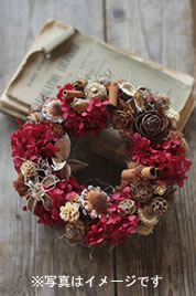 赤いあじさいにシナモンスティックやスターアニス、色んなドライの実ものを合わせた可愛いリースが出来上がります。