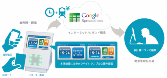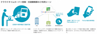 「クラウドタイムカード 営業・交通費精算」はFeliCa ICカードを利用して勤怠記録を行いながら、同時にFeliCa ICカードに記録されている乗車記録の抽出を行い、別途Googleスプレッドシートに保存することで、交通費精算処理の支援を行うためのソリューションです。また、勤怠情報データおよび乗車記録データはGoogle社の提供するクラウドサービス「Google Apps」上のGoogle スプレッドシート(表計算アプリケーション)上に記録/保存することで、簡便な集計/表示を実現しました。